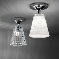 Flow ist eine moderne Tischleuchte, die sich durch einen konischen, mit geometrischen Mustern bearbeiteten Glasdiffusor auszeichnet. Diese kleine Schirmlampe gibt es in drei Farbvarianten: weiß, metallisch oder komplett transparent. Geeignet für die Beleuchtung von Räumen, wie z. B. des Wohn- oder Schlafzimmers. Empfohlen in Kombination mit der Decken- und der Wandleuchtenversion.