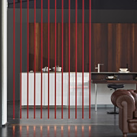 Runde weiße Deckenrosette, an die ein rohrförmiges Element mit LED Lichtquelle angeschlossen ist. Die Elemente, mit denen Sie die Lampe komponieren kann, sind in ihrer gesamten Länge mit Stoff bezogen, der in zwei verschiedenen Farben erhältlich ist: Weiß oder Rot. Die Decken Pendelleuchte kann aus Deckenrosette verschiedener Größen komponieret: klein, mittel oder groß mit einem, neun oder zwölf Elementen (Leuchten). Ideal für die Beleuchtung eines modernen Wohnzimmers oder von Geschäftsräumen.