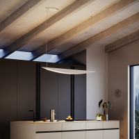 Alba chandelier with a refined design made of recyclable aluminum for a lamp with a low environmental impact. Elegant and sinuous lines that combine with luminous efficiency. Alba represents the union between design and functionality, in fact, thanks to its size, it is ideal as a pendant lamp for lighting offices and meeting rooms. To enhance the natural color of the light, the inside is always white, while the outside is customizable. Available in two sizes and three finishes, white, black, gold.