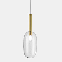 Alchimia is a modern chandelier characterized by a transparent glass diffuser proposed in five different shapes and sizes embellished with natural or antiqued brass finishes. Thanks to its simple, clean and elegant lines, this pendant lamp is suitable for lighting various domestic environments such as the kitchen or living room, offering the possibility of experimenting with combinations of several lamps from the same family.