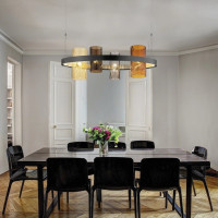 Armonia is a pendant lamp with a refined design but with simple materials. Composed of a metal ring available in black satin nickel for the exterior, while internally it is available in two different finishes, satin brass or copper. Circular effects around a blown glass cylinder that reflects the various historical machining processes used to produce Murano ballotton or straight and twisted rigadin glassware. The glass diffusers are available in various finishes from the most classic such as crystal and smoke to the warmest and most special such as amber and burnt earth. Armonia is available in two versions: 40 cm or 50 cm respectively with one or two light points.
