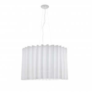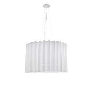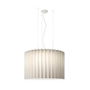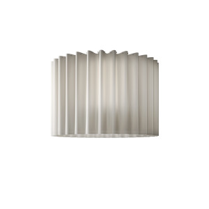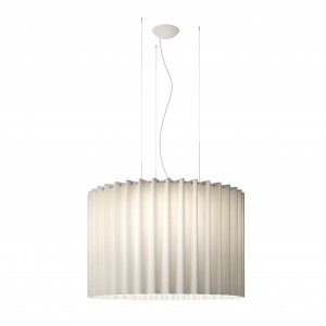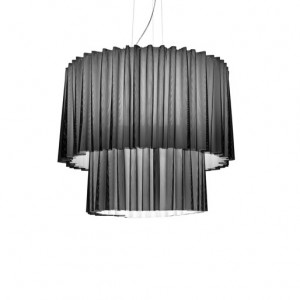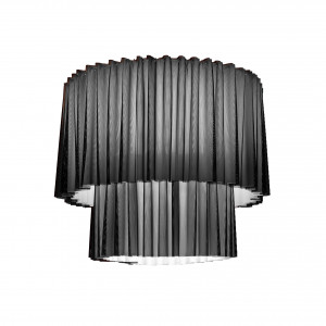 Skirt is a collection of ceiling lights, pendant lamps and ceiling lamps with lampshades in fireproof TREVIRA® CS fabric available in various sizes, levels and finishes ranging from the most neutral colours to the brightest. These lamps are also available in a version with black mesh outer fabric. The chandelier and ceiling light are ideal for the lighting of large commercial environments, such as hotels, shops and restaurants, while the smaller versions can be inserted into living areas and bedrooms. The table lamp is ideal as a lamp with shade for the bedroom as well as for a living room light. The fabric of the lampshade filters the light, making it softer and more delicate, and the wavy shape transmits lightness.