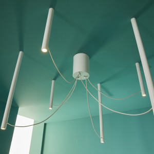 Multispot is a collection of modern chandeliers that differ from each other in the shape of the diffuser. Beluga, Polair and Tooby are the three versions available. The first with a round glass diffuser, Polair features conical diffusers in transparent glass, sandblasted at the bottom, while Tooby features a matt white glass diffuser with a cylindrical and elongated shape. All three versions can be chosen in different sizes with one or more light points and structure in different finishes, anodised or coppered aluminium, black and copper. With the ability to choose between a round or rectangular rosette, Multispot adapts to any environment, be it domestic: living rooms, bedrooms or dining rooms, or contract: such as restaurants or in a reception, for a definitely scenic effect.