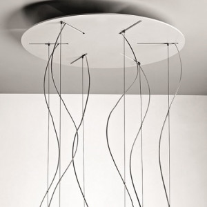 The multiple canopiess are in fact designed to include up to 6-9 suspension lamps. The canopies are offered in both round and linear versions and in multiple sizes. These accessories represent a technical solution that allows you to create luminous cascades with a great visual impact. In addition to the ceiling canopies, the collection includes decentralization kits with which to position the suspension lamps as desired, beyond the location of the power source. The discreet design does not affect aesthetics. The kits are available both for lamps with single cable and for those where one or more steel cables are foreseen.