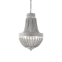 Monet is a shabby chic style chandelier characterized by a metal frame with embossed circular bands and chains with natural wood pearls. This pendant lamp has a classic and elegant design, ideal for illuminating living rooms and lounges with great results from an aesthetic point of view. Offered in different versions of five or six lights with a white matte finish.