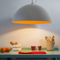 Suspension lamp equipped with a large black lampshade. The surface is covered with a layer of resin that creates a blackboard effect. Unleash creativity by writing and drawing on the speaker, you will create a custom lamp that will give a touch of liveliness to your home. The interior of the lampshade is available in various colors. Diameter 70 cm.
