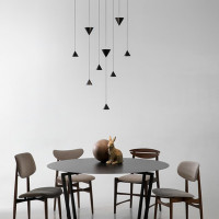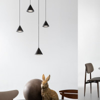 Filomena is a unique suspension and wall system of its kind. Starting from a simple full cone in black aluminum, this creation stands out for its versatility and elegance. The cone diffuser, Filomena's starting point, allows you to create an intense and well-distributed light. Its unique shape allows it to be suspended at different heights thanks to a thin cable, which offers unprecedented flexibility in arranging the lamps. One or two conical bodies can be housed on this thin cable, which spread the light evenly. A smaller cone directs the light beam downwards, creating an intimate and suggestive atmosphere. The larger cone, on the other hand, diffuses the light upwards, illuminating the room evenly and creating general lighting. The distance between the two conical bodies can be adjusted as desired, allowing the lighting to be adapted to the specific needs of the room. Thanks to the special black aluminum deviators, Filomena can be easily hooked to the ceiling or wall. As for the power supply, it can be placed on the floor or recessed into the wall, depending on personal preference. Alternatively, the power supply can be hidden by a white plaster ceiling canopy, decorated with a floral motif relief, which adds a touch of elegance and sophistication.