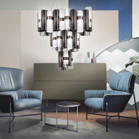 La Lollo is a design circular suspension chandelier inspired by the 1950s. The series of technopolymer cylinders is arranged around a central luminous ring alternating prismatic colors, metallizations, laces, contemporary chromatic gradients and geometric designs. Available in three sizes. This chandelier is suitable for lighting living rooms, bedrooms but also waiting rooms, adding a decorative element to the environment.