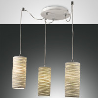 Marbella is a suspension lamp characterized by a cylindrical ceramic diffuser with an embossed processing and a metal structure. The soft colors, the simple shape and the minimal style make Marbella ideal for lighting all domestic environments. It is also available in the three-light version.