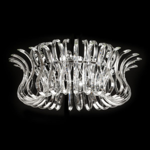 Wave groups modern lamps made of transparent crystal glass. The curved and sinuous shapes and the chromed finish of the metal structure can be admired even when the light is off. This collection is made up of various models of chandeliers of different sizes, also available in ceiling and wall lamp versions. The Wave chandeliers look like a real jewel that captivates the observer's gaze even in a large hall. In addition to the enchanting design of the crystal, from the lighting point of view, Wave lamps create fascinating reflections, creating a very suggestive atmosphere. They are the ideal choice for bedroom or living room lighting. Wave lamps are suitable for installation both in environments characterized by a modern furniture style and in those where a more classic style prevails.