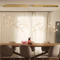 Tulip is a design chandelier made up of numerous tulip-shaped light points with a corolla made of Lentiflex® suspended in space thanks to the steel cable. Each tulip is connected to the others by an intricate of fine copper wire that conducts low voltage electricity. The chandelier is available with 7 or 14 light points and in three versions with a rectangular and round or free standing brushed brass canopy, where it is possible to perform a free configuration of the lamp. Equipped with replaceable and low consumption LED light sources.