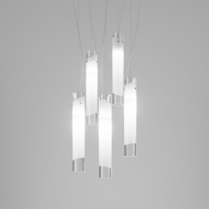 Lio includes modern lamps characterized by a minimalist and discreet style. What the different versions have in common is the tubular shape of the diffuser. This element is characterized by the central white band that reflects the light and returns it in the form of greater brightness. The chandelier version is offered in different sizes. Available with single or multiple diffusers arranged either in a linear or cluster ceiling rosette. These pendant lamps can be used for lighting various home environments in combination with the wall-mounted versions with one or two light points, or the table and floor versions. Same materials also for ceiling lights, proposed this time in a circle shape. Available in various sizes to be used also as wall lights. Perfect for lighting multiple spaces such as kitchens, living rooms, corridors and entrances. The simple and discreet lines make them perfect for any type of furnishing style.
