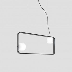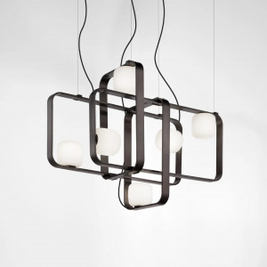Peggy is a collection composed of wall lamps and hanging lamps with a contemporary style. The hand-blown white blown glass together with the lead-colored shiny metal frame make the Peggy collection its distinctive features. Light sources with contrasting colors, such as white and black, without, however, abandoning the elegance that distinguishes them. From the single light wall lamp ideal for corridors or living rooms to the pendant lamp available in two different shapes, with a great optical effect for dining tables or living rooms with a modern and sophisticated style. The pendant chandelier of the collection can be purchased as a single suspension, playing through the combination of them at different lengths, or as a suspension for nine lights. A particularly important collection for Vistosi, as the suspended version of the collection illuminates the café of the Peggy Guggenheim Museum in Venice, becoming one of the brand's characteristic chandeliers. The Peggy collection is available in two different finishes: black or brass.