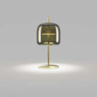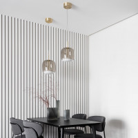 Jube est une suspension design de style vintage. Cette lampe est caractérisée par un diffuseur en verre soufflé, qui prend forme à partir du chevauchement et de la fusion de deux verres. L'effet créé est un ton sur ton qui donne à la lampe un aspect retro. Le verre inférieur est blanc tandis que la partie supérieure est disponible dans les tons suivants: fumé, terre brûlée, vert antique, cristal. Les parties métalliques sont en or satiné. Jube est doté d'une source de lumière LED et est proposé dans différentes formes et tailles.
