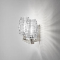 Spot en cristal soufflé recouvert à la main avec fils en verre fondu, qui créent une texture à bourbillon. Cette petite et lumineuse lampe est installable au mur ou au plafond et est disponible en finitions blanche, noire ou transparente. Parties métalliques: nickel satiné.