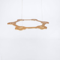 Lampada a sospensione di design dal diametro di 98 cm. La struttura è composta da due lamine in alluminio anodizzato e uno strato di metacrilato trasparente. La luce LED viene emanata dai 12 punti luce realizzati in policarbonato ed è indiretta verso l'alto e verso il basso. Il driver di alimentazione dimmerabile è incluso nel rosone.