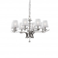 Montatura in cromo. Corpo centrale, bobeches e pendagli in cristallo molato. Paralumi in organza. Dimensioni: 430x335x205 mm.